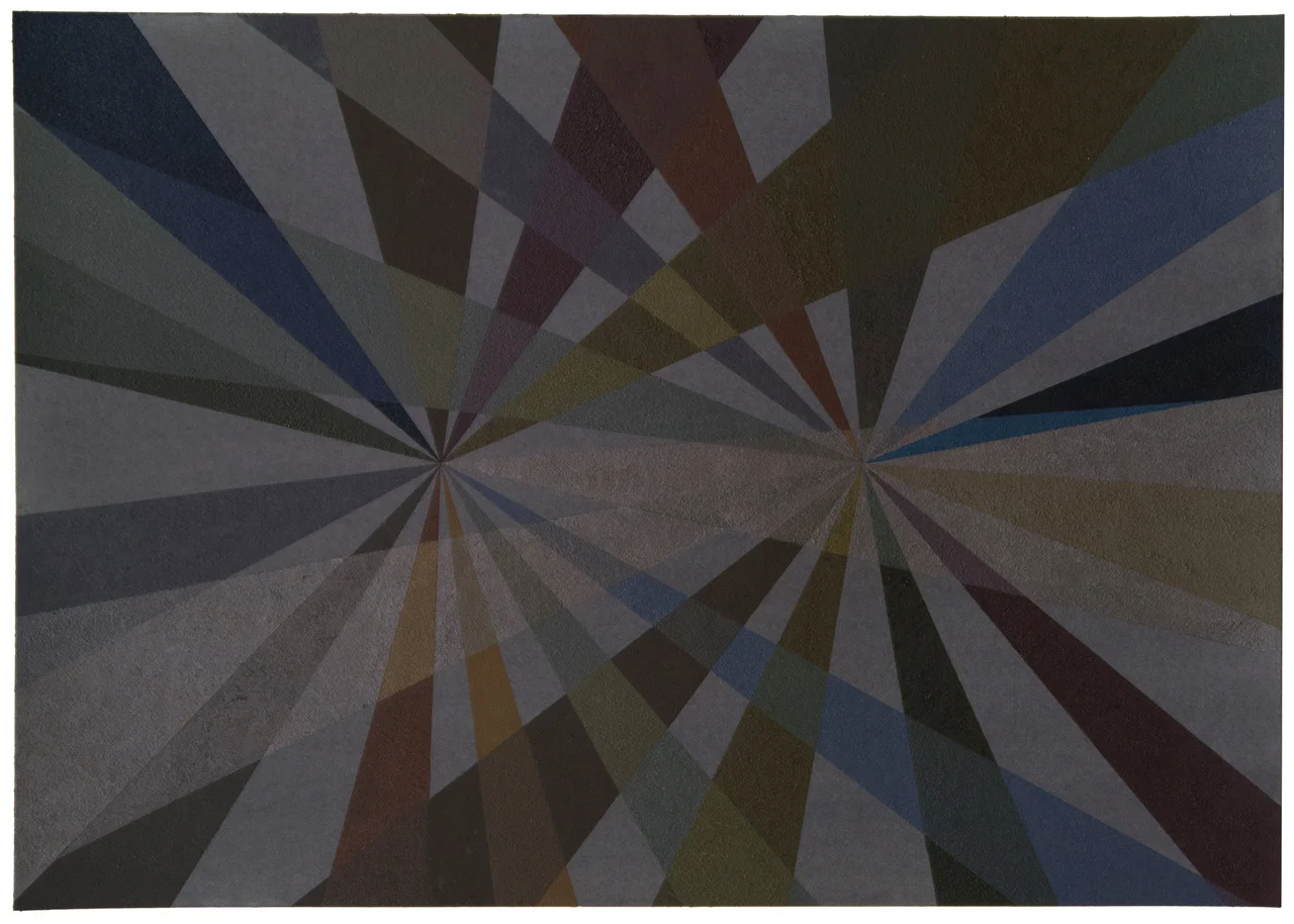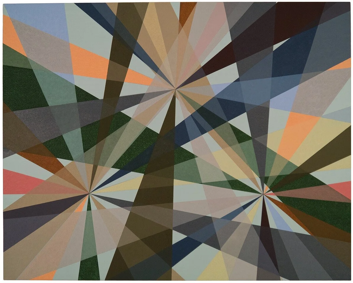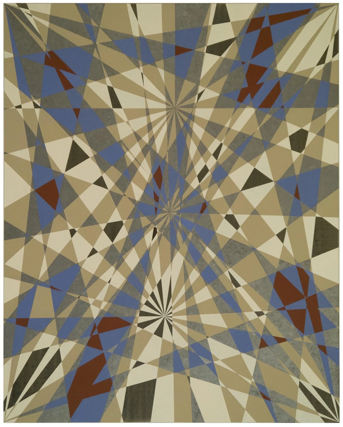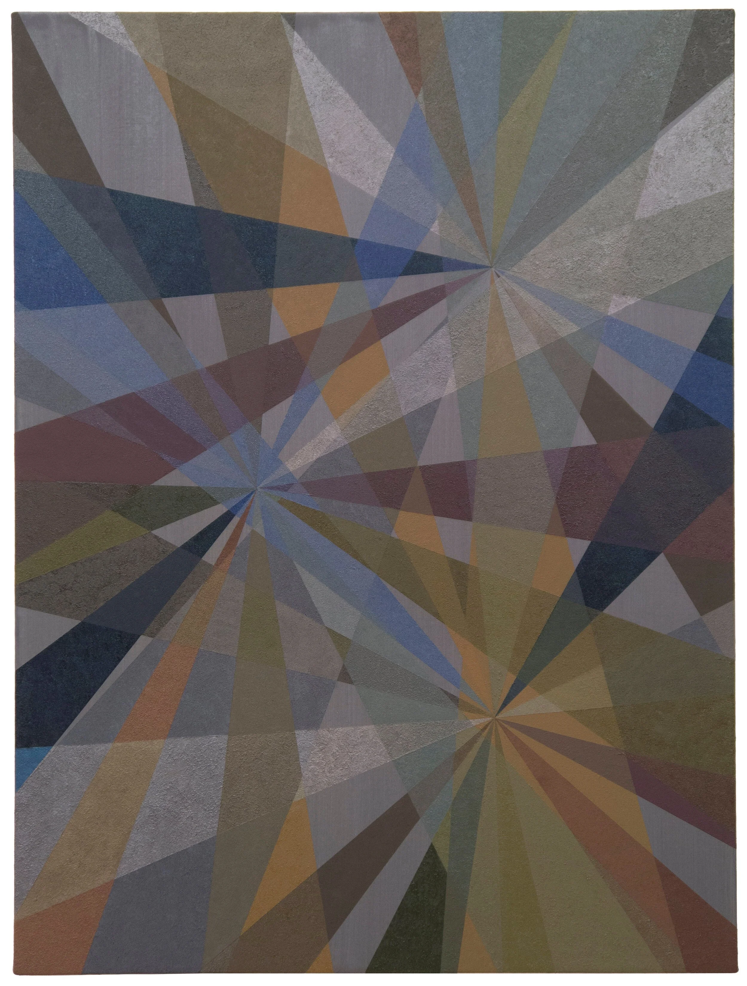 The imagery of this series was inspired by walks in the woods, where I began to notice how at certain times of day the trees filtered the sun to create interlocking networks of light and shadow. Each painting builds a structure out of different numbers of “trees,” with each point containing 24 color or tone-based divisions, analogous to the hours in each day. As the work progressed I discovered my series title in the Elvis Costello song “Complicated Shadows,” and began to think outside of the specificity of landscape, and envision how these intersecting nodes could also suggest human or other time-based interactions.